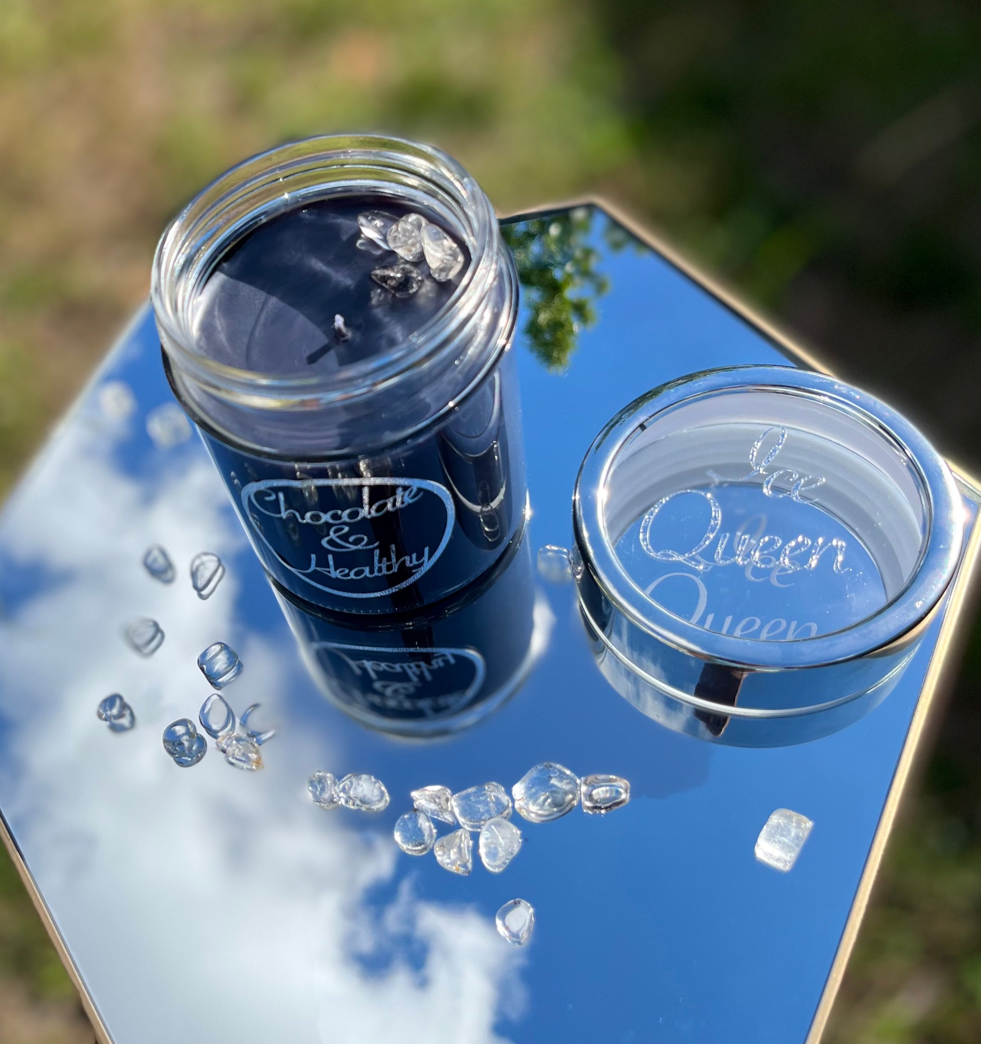 Made with nature friendly candle dye and clear quartz crystals. The crystals will sink as the candle burns, however you can remove them if you wish.